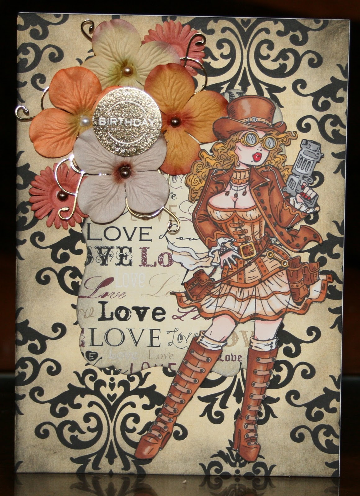 The first one is a Kenny K digital image coloured with the trusty pro markers, just love the Kenny K stuff, it's a bit different and oh so sexy. The papers are Pink Pettycoat from the old fashioned girl set and the flowers were just kinda floating around the stash box.